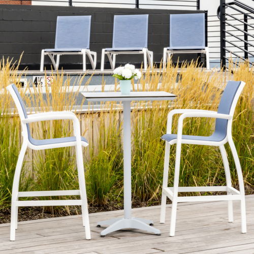 Designed for comfort and style, the Sunset Barstool is a versatile addition to any bar area. Crafted using Grosfillex’s Air Molding Technology, it offers the aesthetic of cast metal without the associated weight or risk of rust. The barstool features a replaceable sling made from UV-resistant, antimicrobial Textilene fabric, ensuring longevity and hygiene. Its powder-coated aluminum base provides stability, while nylon footpads protect flooring surfaces.